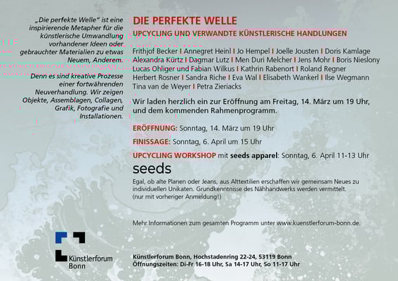 Die Ausstellung zum Thema Upcycling wird am 14.3.2025 ab 19 Uhr im Künsterforum in Bonn eröffnet werden und ich freue mich sehr über Besucher.