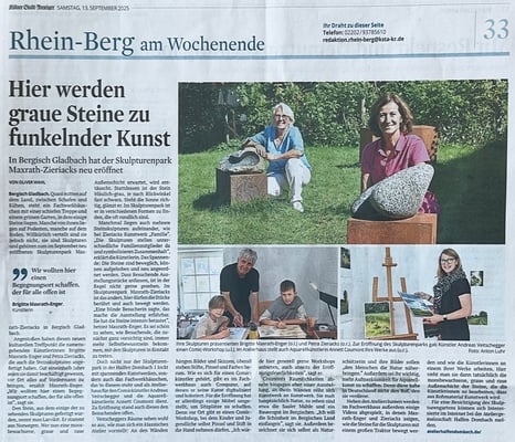 Die Eröffnung der Skulpturenausstellung zum Thema Mut findet am 7.5.2023 ab 15 Uhr im Steinbruch am Sinneswald in Leichlingen mit Feier zum 30jährigen Jubiläum statt.